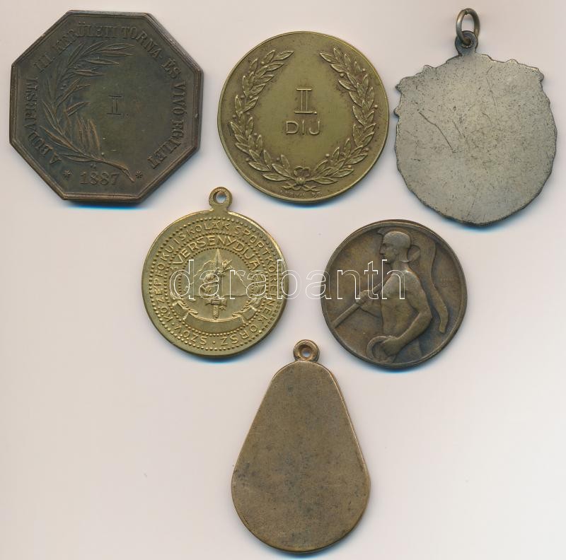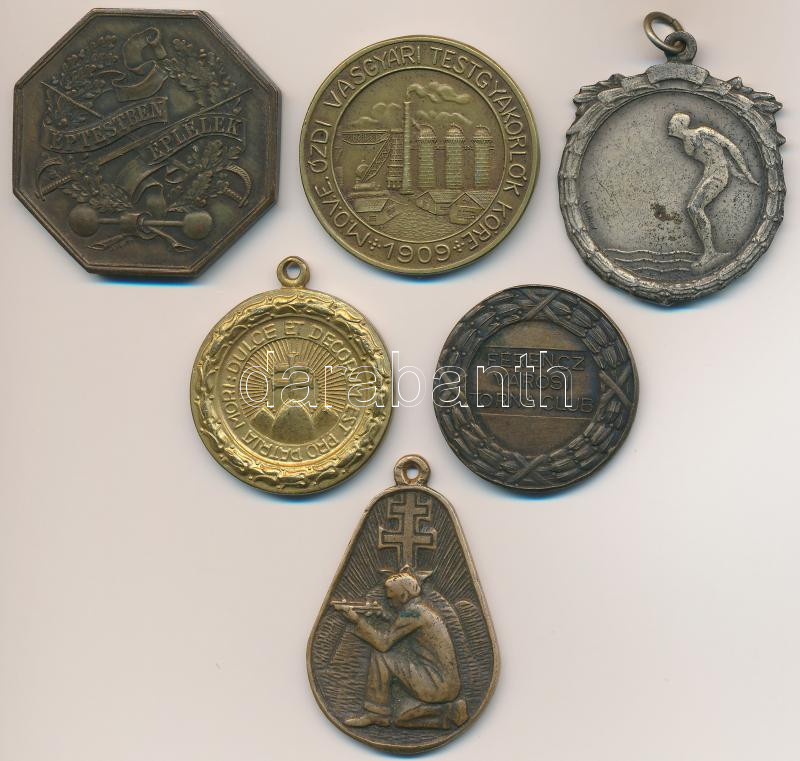 Leírás: 6db-os vegyes magyar sportérem tétel, közte DN "Ép testben ép lélek / A Budapesti III. Kerületi Torna- és Vívó Egylet - II." Br díjérem (38mm), "M.O.V.E. Ózdi Vasgyári Testgyakorlók Köre - 1909 / II. díj" Br díjérem "LUDVIG BP" gyártói jelzéssel (35mm) T:2,2-