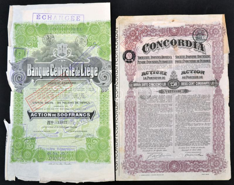 Belgium / Liége 1911. "Liége Központi Bank" részvény 500Fr-ról, szelvényekkel és bélyegzésekkel + Románia / Bukarest 1924. "Concordia - Román Olajtársaság" részvénye 250L-ről, szelvényekkel és felülbélyegzésekkel T:III ragasztásnyom