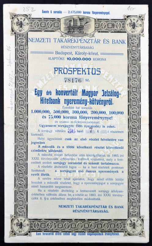 Leírás: Budapest 1907. "Nemzeti Takarékpénztár és Bank Részvénytársaság" prospektusa egy darab konvertált Magyar Jelzálog-Hitelbank nyeremény-kötvényről T:III