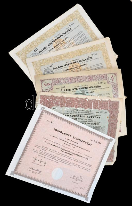 Leírás: Budapest 1925. "Magyar Királyság 5%-kal kamatozó járadékkölcsön" államadóssági kötvény 125.000K-ról, szelvényekkel + 1941. "4%-kal kamatozó Állami Nyereménykölcsön" államadóssági kötvények 200P-ről (2x) sorszámkövetők, mindkettő szelvényekkel, szárazpecséttel és felülbélyegzéssel + "4%-kal kamatozó Állami Nyereménykölcsön" államadóssági kötvény 50P-ről, szelvényekkel és szárazpecséttel + 1946. "Ideiglenes elismervény" 3%-kal kamatozó törlesztéses kölcsönkötvényről (búzakötvény) T:vegyes