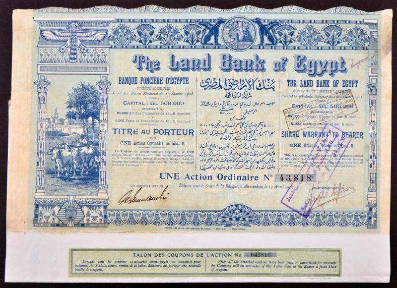 Egypt/Alexandria 1905. "The Land Bank of Egypt" share about 5 Pounds, with coupons, overprint and embossed stamp C:F glued