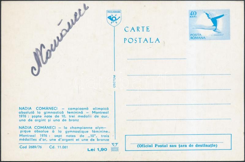 Leírás: 1976 1975 Nadia Comăneci(1961-) többszörös olimpiai bajnok román tornász aláírása az őt ábrázoló képeslapon / autograph signature