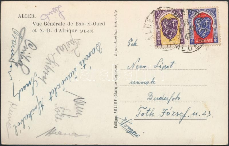 Leírás: Lantos Mihály (1928-1989) focista és BVSC-csapattársai aláírásai Algériából megküldött levelezőlapon