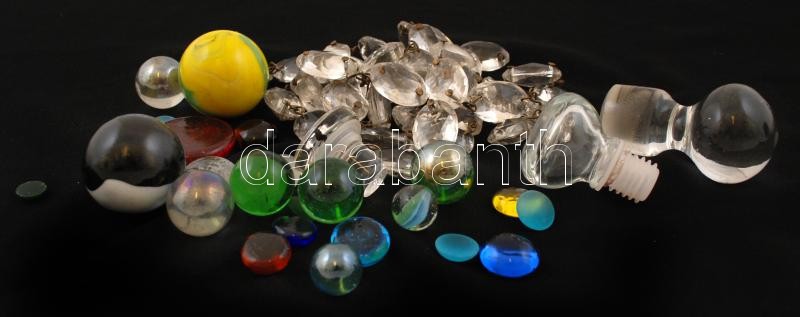 Leírás: Kis üveg tétel, golyókkal, csiszolt üvegekkel, stb., 67 db