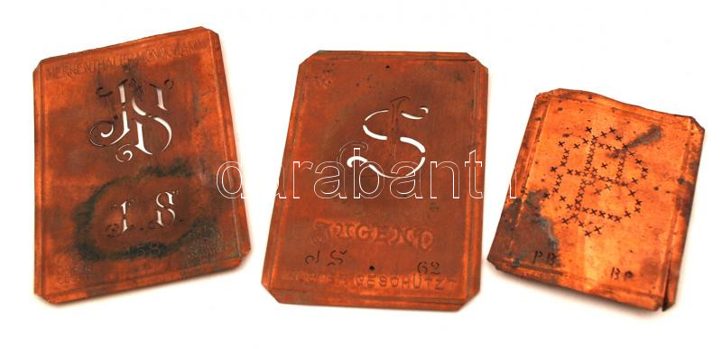 Leírás: Réz monogram sablonok, vegyes méretben és minőségben, cca 6x4cm és 7x5cm között