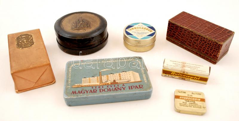 Leírás: Vegyes kis doboz tétel: Magyar Dohány Ipar, Tannocarbon tabletta, Hydrocodin, Quinoseptyl, Órás és ékszerész, stb.