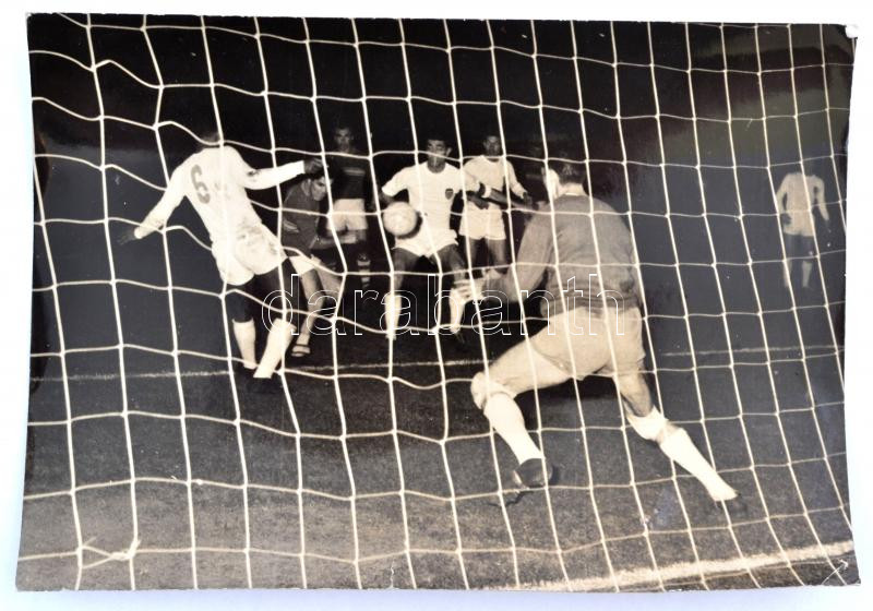 1962 Meleg helyzet a Valencia kapuja előtt, Valencia-MTK(7:3) meccs, a Vásárvárosok Kupa elődöntője, Pobua fotó, hátoldalon feliratozva, kis szakadással, 13x18 cm