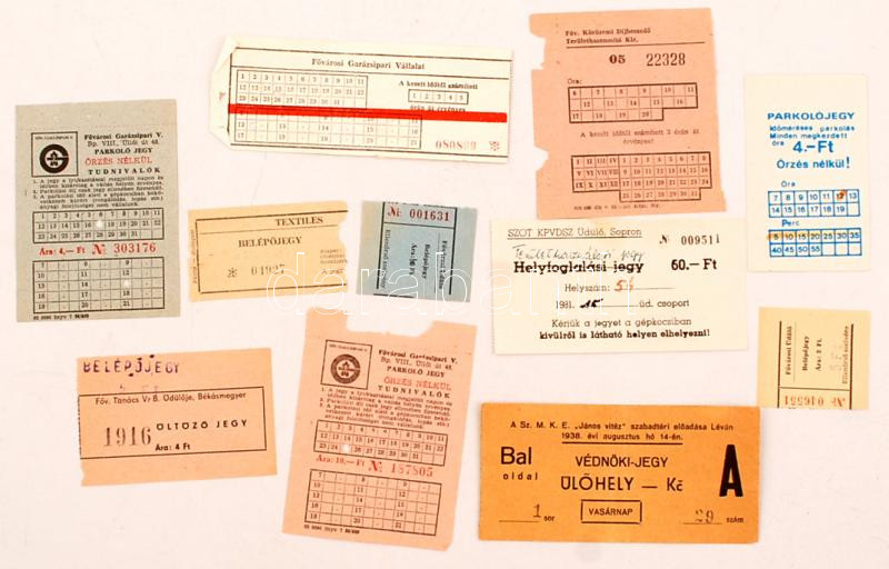 Leírás: cca 1938-60 Vegyes jegy tétel, parkolójegy, területhasználati, védnöki jegy stb, vegyes méretben és minőségben, 11db