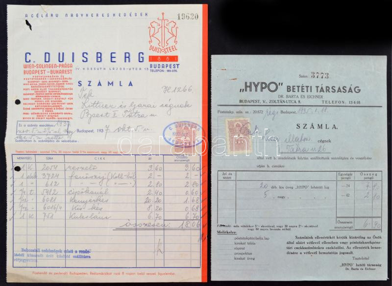 Leírás: 1935, 1937 Bp., "HYPO" Betéti Társaság C. Duisberg Aélcáru Nagykereskedések fejléces számlája okmánybélyegekkel