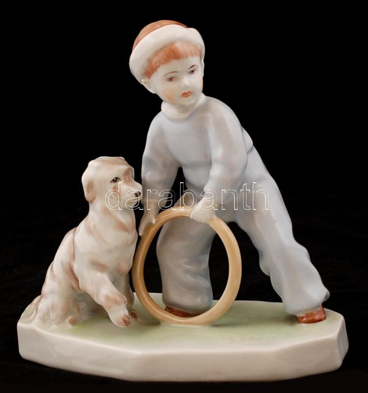 Leírás: Zsolnay karikázó kisfiú a kutyával, kézzel festett, hibátlan, jelzett (Sinkó), h: 19 cm, m:18 cm