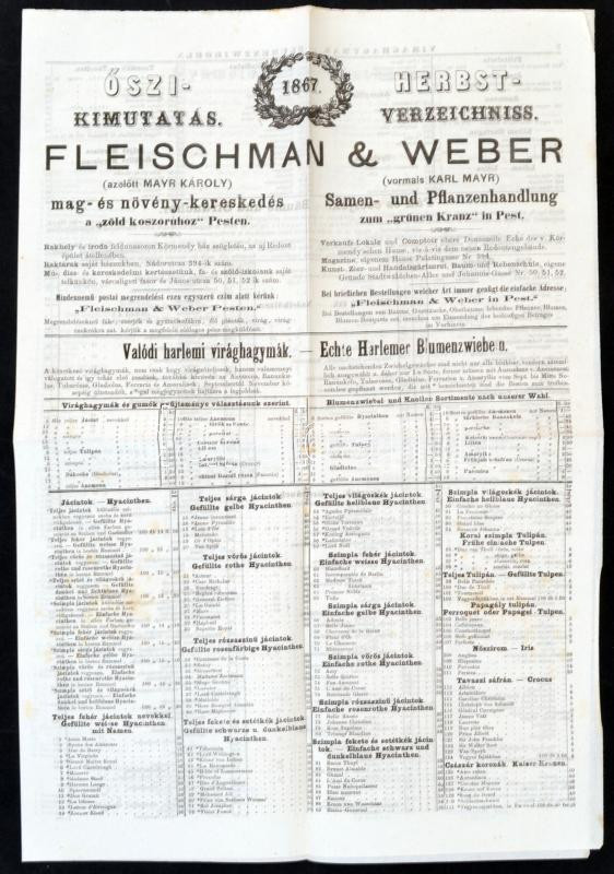 1867 Pest, a Fleischmal & Weber mag- és növénykereskedés őszi kimutatása, számos érdekes növény árjegyzékével, magyar és német nyelven, 4 p. /