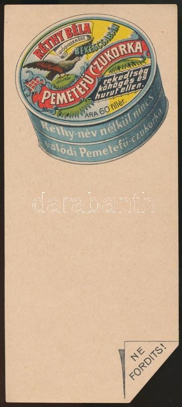 Leírás: "Réthy Béla gyógyszerész Békéscsabán" pemetefű cukorka kétoldalas számolócédula