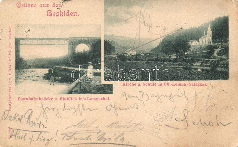 Leírás: 1899 Horní Lomná, Ober Lomna; Beskiden, Kirche, Schule, Eisenbahnbrücke, Lomnathal / church, school, railway bridge, valley; Eduard FeitzingerNr. 120. (EK)