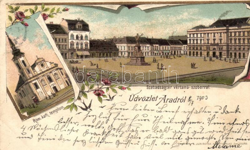 Leírás: Arad, Szabadság tér, Vértanú szobor, Római katolikus templom / square, statue, church, Jurischek Kunstverlag floral, litho (vágott / cut)