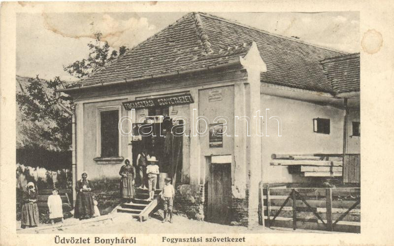 Leírás: Bonyha, Bahnea; Fogyasztási szövetkezet, kiadja a Bonyhai fogyasztási szövetkezet / cooperative shop (fl)