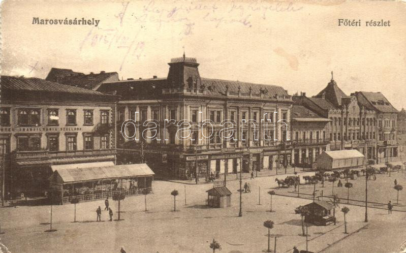 Marosvásárhely, Targu Mures; Főtér, Transylvania Szálloda és Kávéház, Pallos és Papné üzlete, Pocsanov Márton ruházati boltja, kiadja Porjes S. Sándor / Hotel and Coffe Shop Transylvania, shops (EK)