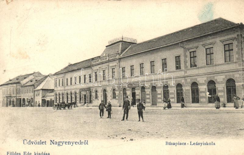 Leírás: Nagyenyed, Aiud; Búzapiac, Leányiskola, Farkas Sámuel és Fesztinger Dávid üzletei, kiadja Földes Ede / wheat market, girls school, shops (EB)