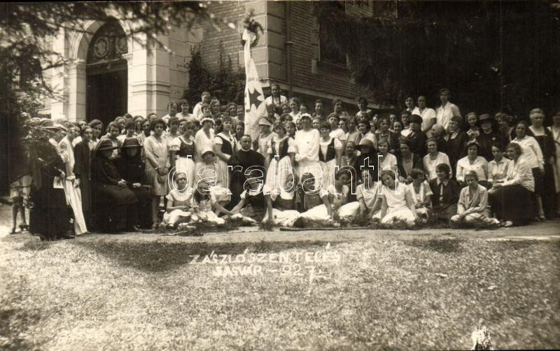 Leírás: 1927 Sasvár, Sastin; Zászlószentelés, csoportkép / flag dedication, group photo