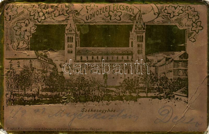 Leírás: 1899 Pécs, Székesegyház, kiadja Fischer Ferenc könyv- és zenemű kereskedése, floral, metallic (EB)