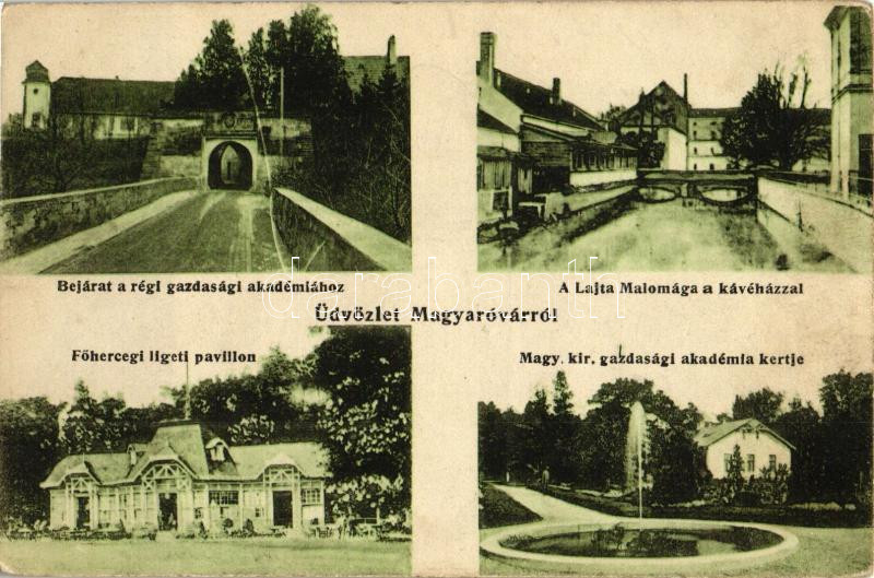 Mosonmagyaróvár, Magyaróvár; a régi gazdasági akadémia bejárata, Lajta Malomága a kávéházzal, Főhercegi ligeti pavilon, a gazdasági akadémia kertje (EB)