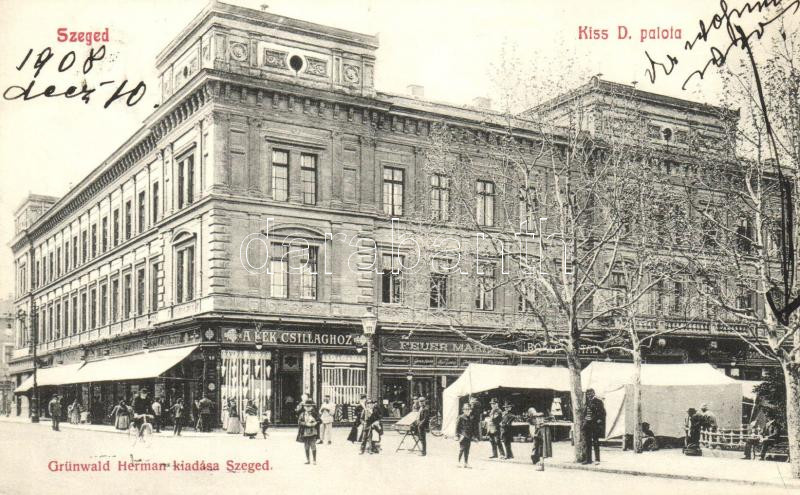 Leírás: Szeged, Kiss D. palota, Étterem a Kék Csillaghoz, Feuer Márton üzlete, piac, kiadja Grünwald Hermann