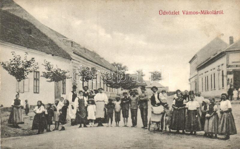 Leírás: Vámosmikola, csoportkép, Grossman üzlete, kiadja Grossman Lajos (vágott / cut)