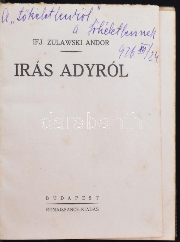 Zulawski: Irás Adyról. Bp., é.n. Renaissance (Korvin Testvérek ny.) 160 p. Korabeli kartonkötésben. Ajándékozási bejegyzéssel, illetve több helyen ceruzás bejegyzésekkel, margináliákkal.