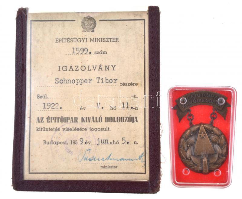 Leírás: 1959. "Az Építőipar Kiváló Dolgozója" Br kitüntetés nem eredeti tokban, igazolvánnyal T:2