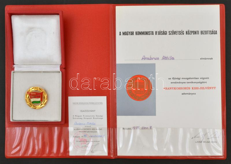 Leírás: 1975. "KISZ aranykoszorús jelvény" aranyozott, zománcozott kitüntető jelvény dísztokban, adományozói okirattal, igazolvánnyal T:1