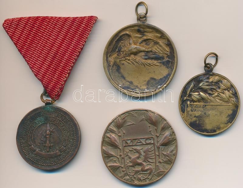 4db klf sportérem, közte ~1920. "Magyar Athletikai Club 1875. / MAC" Br sportérem (37mm), "Középfokú Iskolák Sportköreinek Országos Szövetsége Versenydíja / Dulce et decorum est pro patria mori (Édes és dicső dolog a hazáért meghalni)" Br díjérem mellszalagon (31mm) T:2,2- ph.
