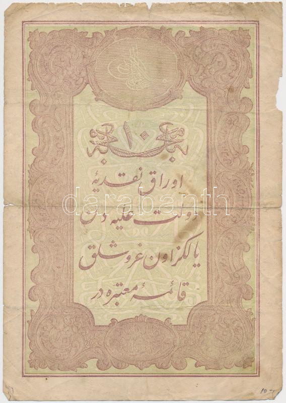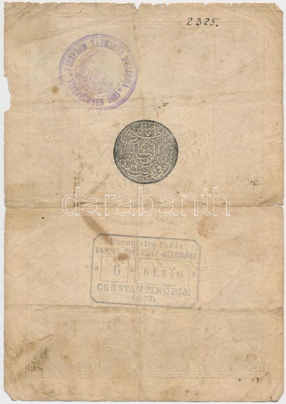 Oszmán Birodalom 1876. (1293) 10k bankjegy "Galip (1)293" bélyegzéssel, "Oszmán Birodalmi Bank - Konstantinápoly 1876" bélyegzéssel, valamint "Veszprém Vármegye Múzeuma 1903" bélyegzéssel a hátoldalán T:III-