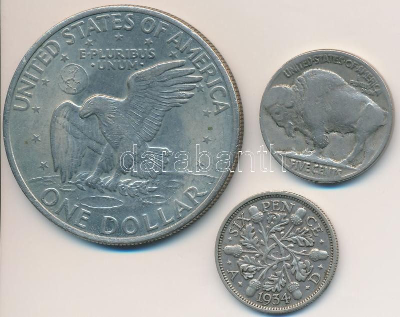 Leírás: Vegyes: Amerikai Egyesült Államok 1937. 5c Cu-Ni "Buffalo" + 1971. 1$ Cu-Ni "Eisenhower" + Nagy-Britannia 1934. 6P Ag "V. György" T:2,2-