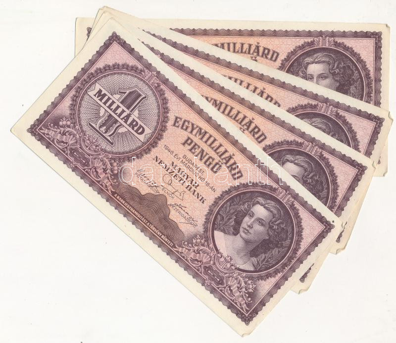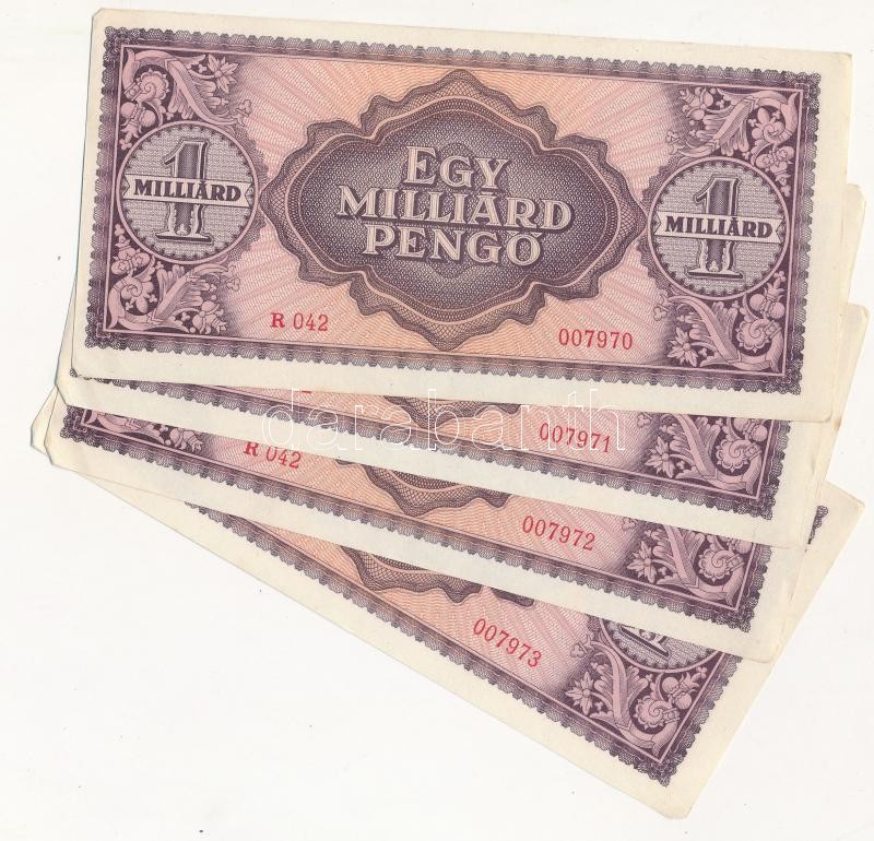 1946. 1.000.000.000P (4x) sorszámkövetők T:I- https://www.darabanth.com/hu/256-Gyorsarveres/256.0/Numizmatika/Magyar-bankjegyek~200008/1946-1000000000P-4x-sorszamkovetok-TI-~II1255764