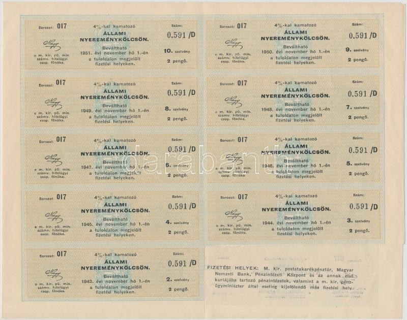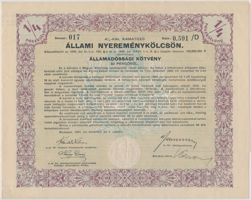 1941. "4%-kal kamatozó állami nyereménykölcsön" 1/4 államadóssági rész... https://www.darabanth.com/hu/256-Gyorsarveres/256.0/Numizmatika/Reszvenyek-es-sorsjegyek~200006/1941-425-kal-kamatozo-allami-nyeremenykolcson-14-allamadossagi-reszkotvenye-50P-rol-s~II1256600