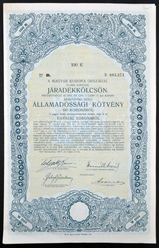 Leírás: Budapest 1917. "A Magyar Korona Országai 6%-kal kamatozó Járadékkölcsön" államadóssági kötvénye 100K-ról szelvényekkel T:I-,II