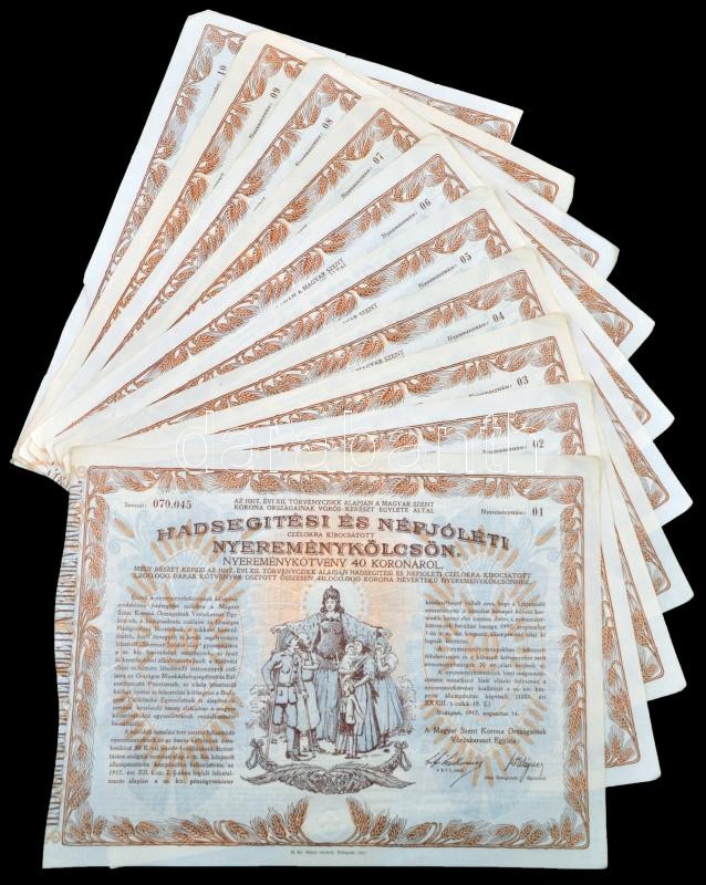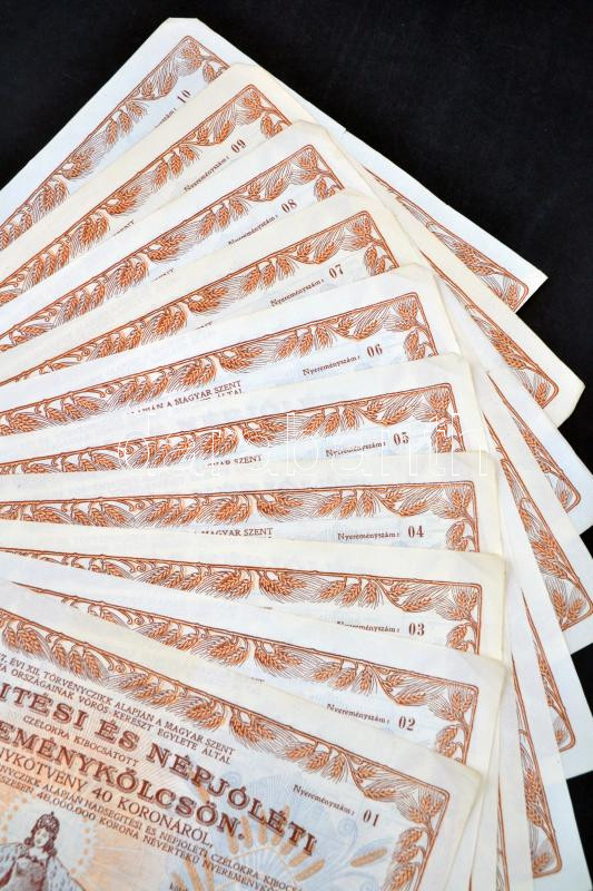 Leírás: Budapest 1917. "Hadsegítési és Népjóléti nyereménykölcsön" nyereménykötvények 40K-ról, szárazpecséttel (10x) sorszámkövetők, kötegelővel T:II-III