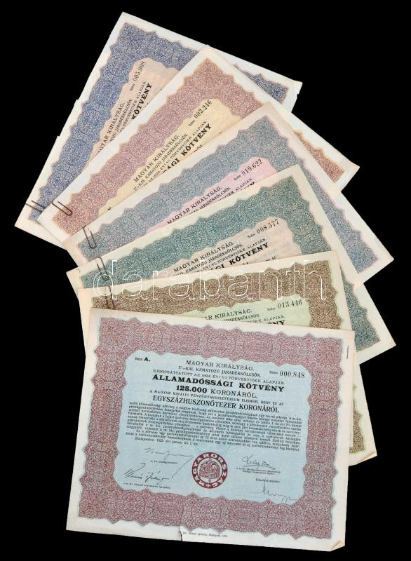 Leírás: Budapest 1925. "Magyar Királyság 5%-kal kamatozó Járadékkölcsön Államadóssági Kötvény" 125.000K, 250.000K, 500.000K, 1.000.000K, 5.000.000K és 10.000.000K-ról szelvényekkel T:II-III
