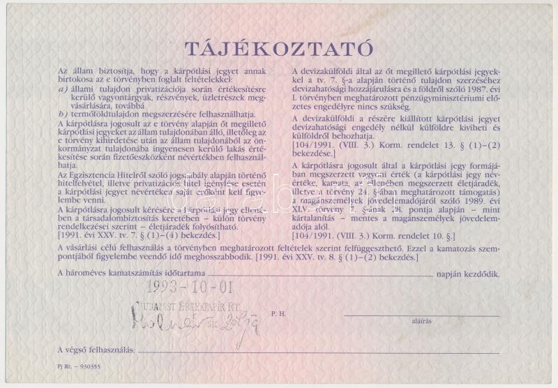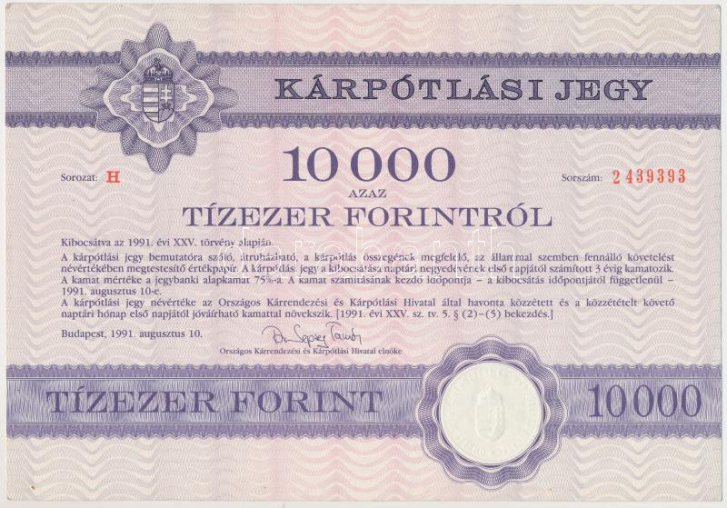 Leírás: Budapest 1991. "Országos Kárrendezési és Kárpótlási Hivatal" kárpótlási jegye 10.000Ft-ról, "H" sorozat T:II