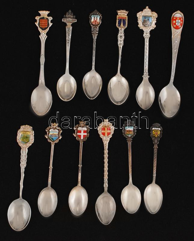 Leírás: 12 db zománcozott városképes és országcímeres kanál gyűjtemény sok szép ezüstözött darabbal / Collection of enameled spoons