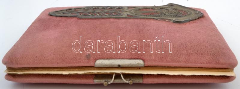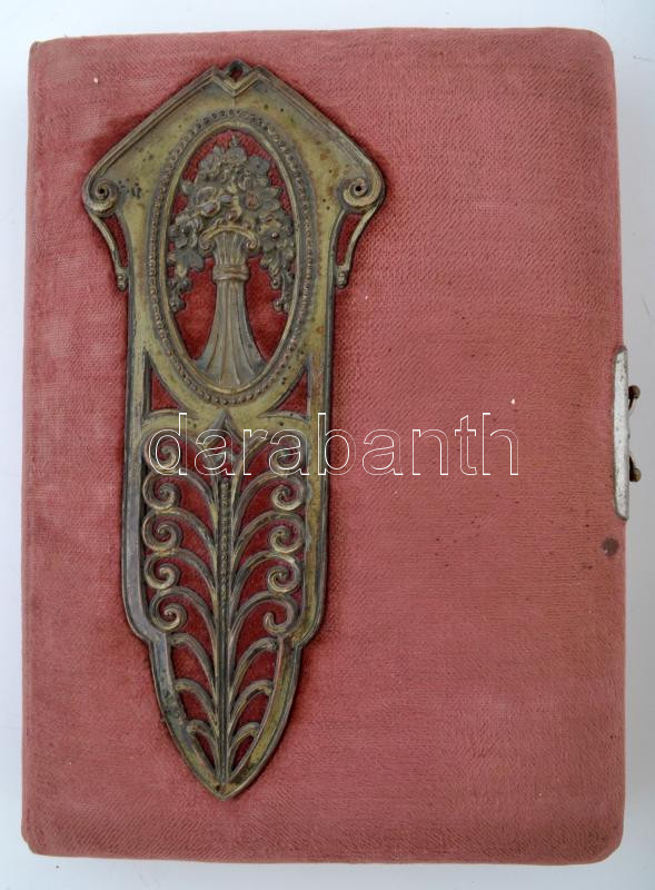 Leírás: 1915 Régi emlékkönyv, számos érdekes bejegyzéssel. Kissé kopott bársonykötésben, aranyozott élekkel, szecessziós fém dekorációval.
