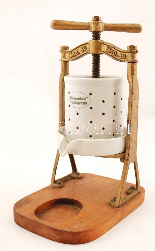 "Frauenlob" Régi, kézi szőlőprés, kerámia edénnyel, 30x15cm https://www.darabanth.com/hu/257-Gyorsarveres/257.0/Festmeny-mutargy-papirregiseg-egyeb/Bolhapiac~10/Frauenlob-Regi-kezi-szolopres-keramia-edennyel-30x15cm~II1260877