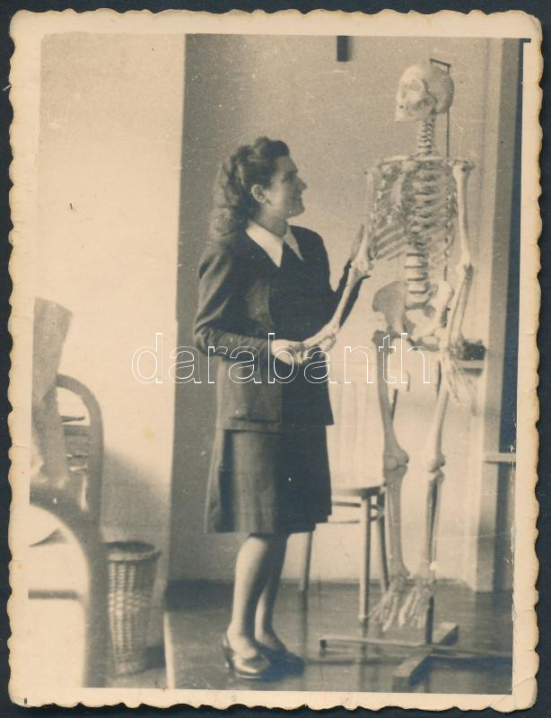 cca 1930-40 Csontvázzal ismerkedő hölgy, fotó, 8x6,5cm https://www.darabanth.com/hu/257-Gyorsarveres/257.0/Festmeny-mutargy-papirregiseg-egyeb/Foto~19/cca-1930-40-Csontvazzal-ismerkedo-holgy-foto-8x6-5cm~II1264219