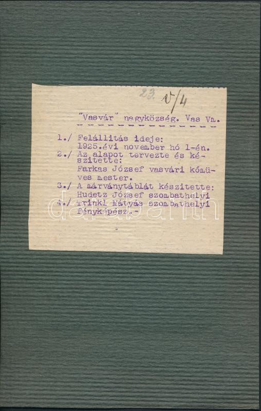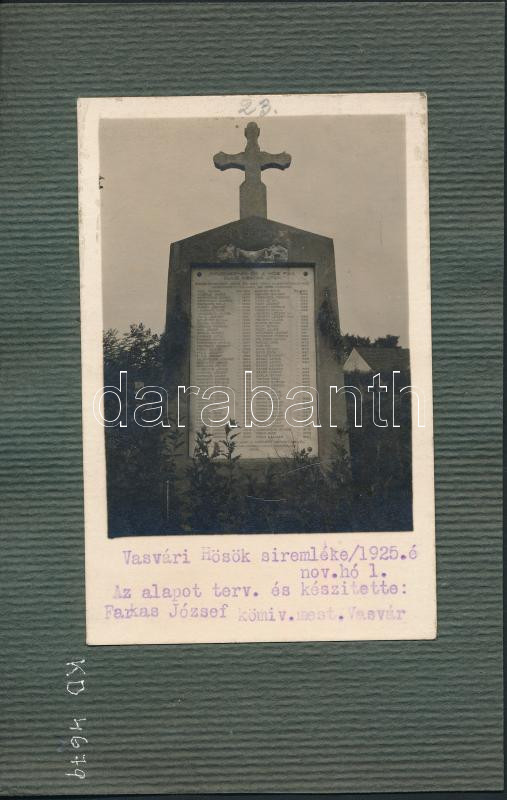 cca 1925-30 I. világháborús emlék Vasváron, fotó kartonra kasírozva, v... https://www.darabanth.com/hu/257-Gyorsarveres/257.0/Festmeny-mutargy-papirregiseg-egyeb/Militaria~26/cca-1925-30-I-vilaghaborus-emlek-Vasvaron-foto-kartonra-kasirozva-verzon-reszletes-infor~II1260413