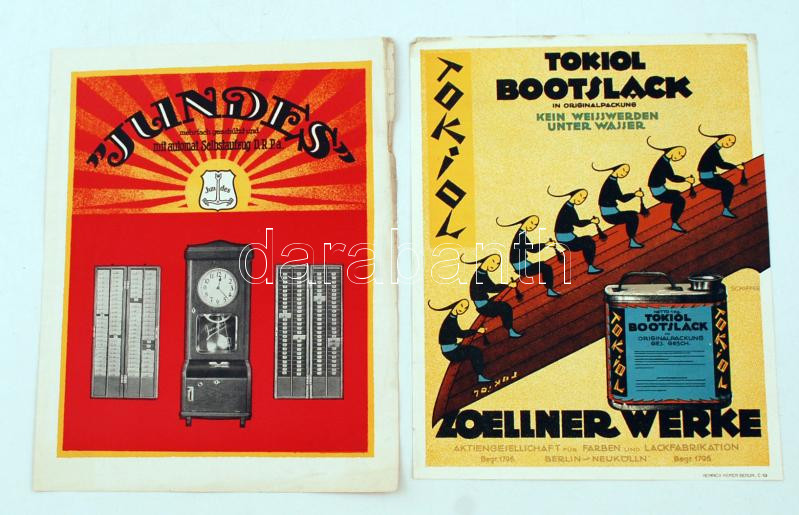 Leírás: cca 1920 Jundes bélyegzőóra és Tokiol csónaklakk kétoldalas reklámnyomtatványok, 2db, 22x28cm