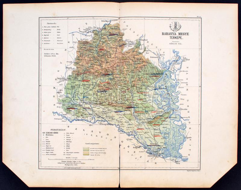 Baranya megye térképe, Gönczy Pál - Kogutowicz Manó: Magyarország megyéinek kézi atlasza. Tervezte: - -, rajzolta: - - Bp. (1890.) Posner Károly Lajos és fia. Sarok levágva,hajtás mentén szakadással, 45x57cm