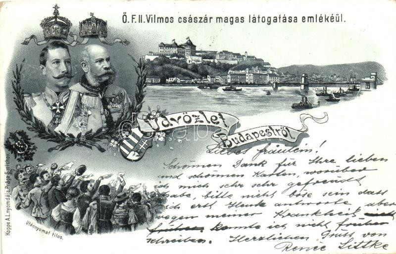 Leírás: 1897 Budapest, Őfelsége II. Vilmos császár magas látogatása emlékéül, Ferenc József, Koppe A.L. nyomdája litho (r)