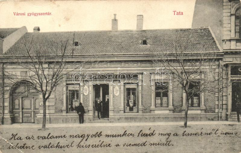 Tata, Városi gyógyszertár; kiadja Nobel Adolf (EB) https://www.darabanth.com/hu/257-Gyorsarveres/257.0/Kepeslapok/Magyarorszag~400010/Tata-Varosi-gyogyszertar-kiadja-Nobel-Adolf-EB~II1261557