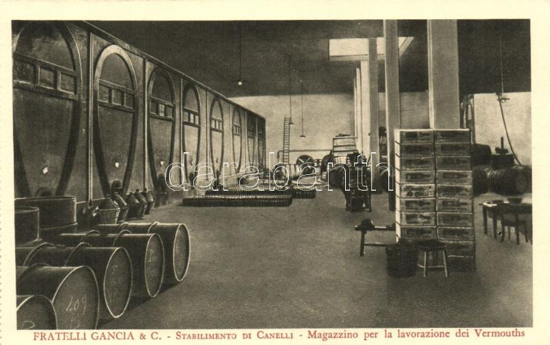 Leírás: Canelli, Fratelli Gancia & C., 'Magazzino per la lavorazione dei Vermouths' / vermouth processing warehouse, from postcard booklet