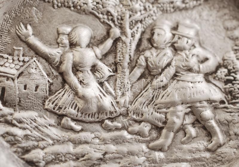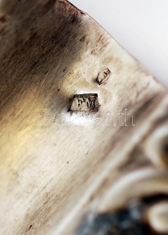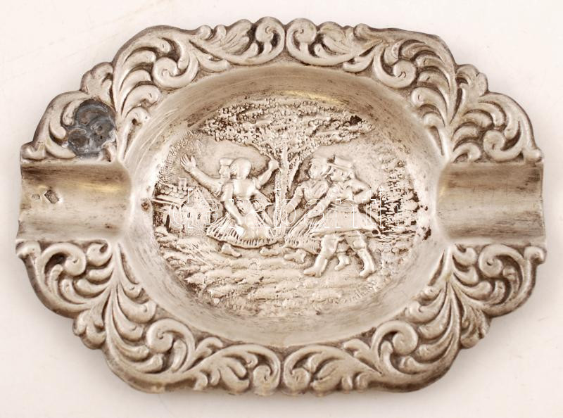 Leírás: Ezüst (Ag.) kis hamuzó, mulatós jelenettel, jelzett, mesterjeggyel (FM), javított, 10×7 cm, nettó:22 g
