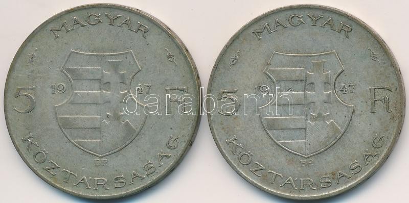 1947. 5Ft Ag "Kossuth" (2x) T:2-,3 ph. https://www.darabanth.com/hu/257-Gyorsarveres/257.0/Numizmatika/Magyar-es-magyar-verdejelu-fem-es-ezustpenzek~200008/1947-5Ft-Ag-Kossuth-2x-T2-3-ph~II1259447